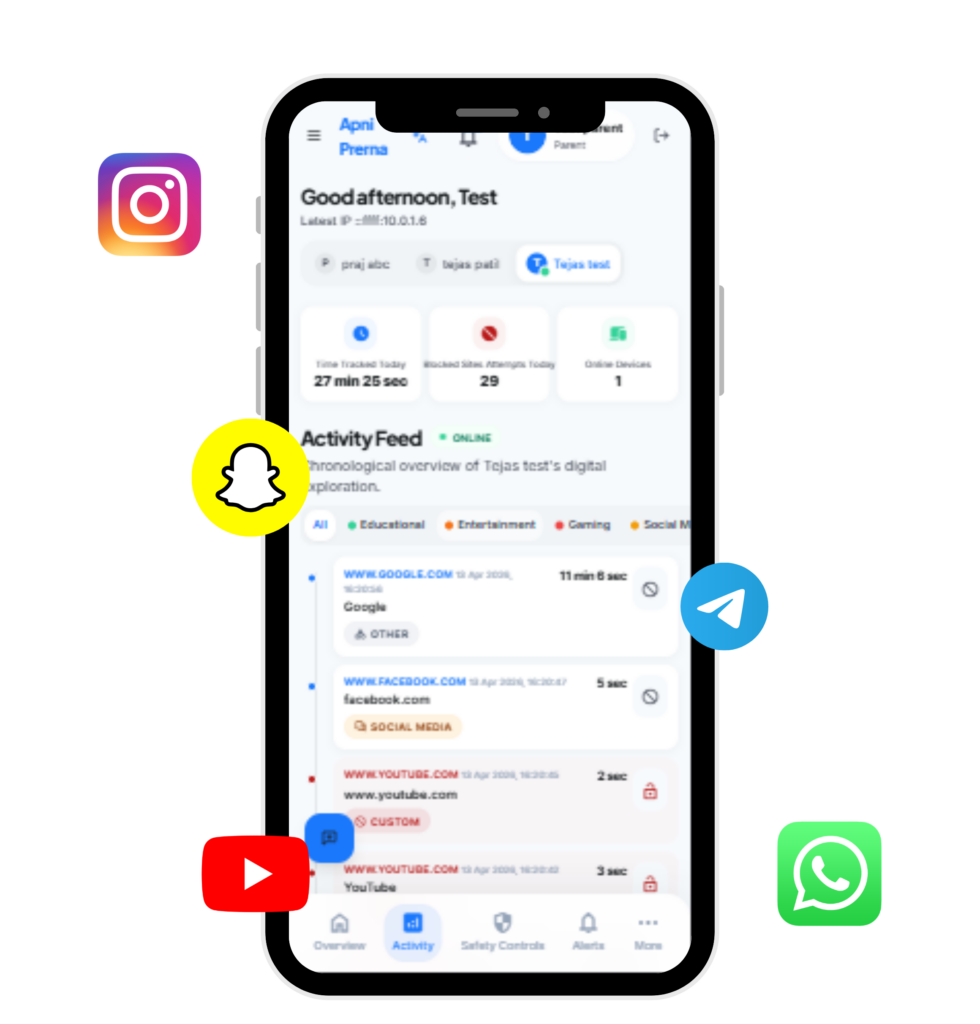 Apni Prerna helps parents create a smart digital space for children by blocking harmful sites, reducing distractions, and promoting responsible technology use.